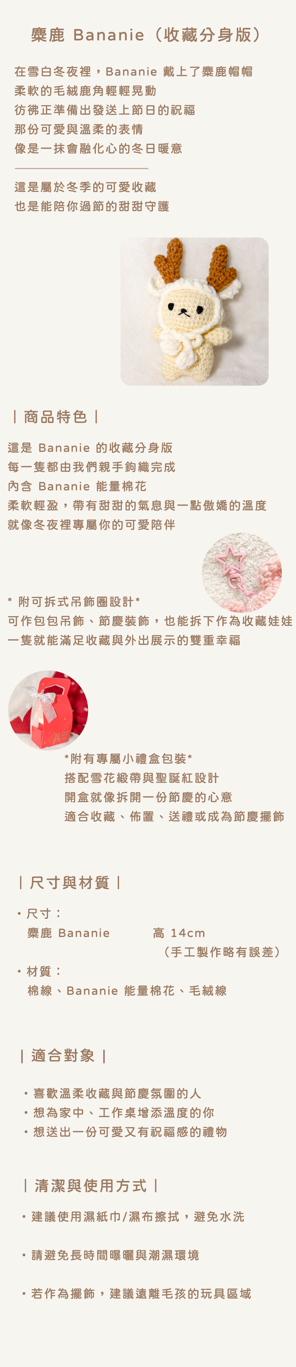 手工鉤織的麋鹿 Bananie,內含 Bananie 能量棉花,柔軟又充滿節慶氣息🦌