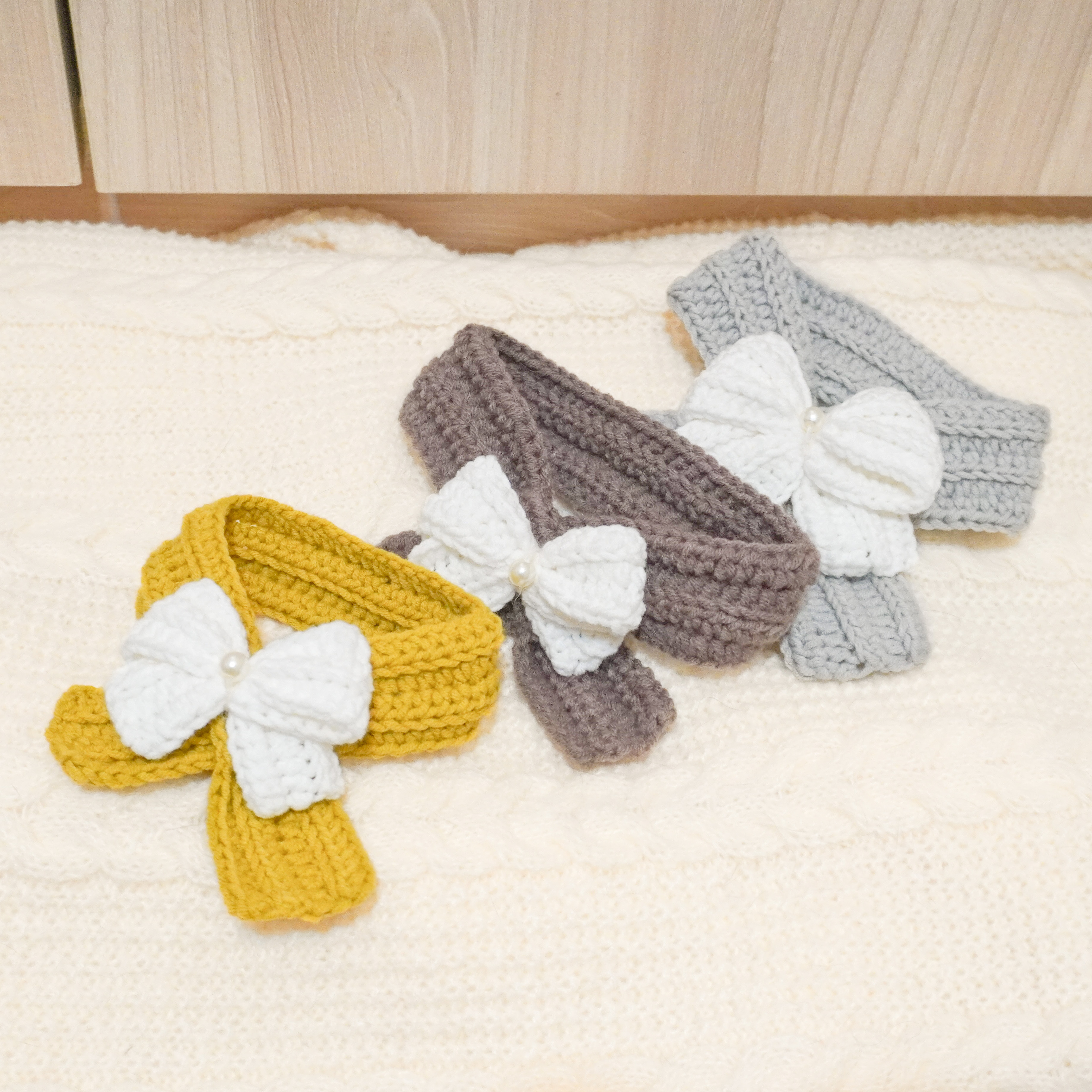 這款【Fée d'Hiver】系列是為天生具有貴氣氣場的毛孩而生。我們將冬日特有的厚實織紋,與輕柔優雅的蝴蝶結完美揉合,並在視覺核心嵌入一顆精品珍珠。這不僅是一件圍巾,更是妳為毛孩定製的一場視覺盛宴。