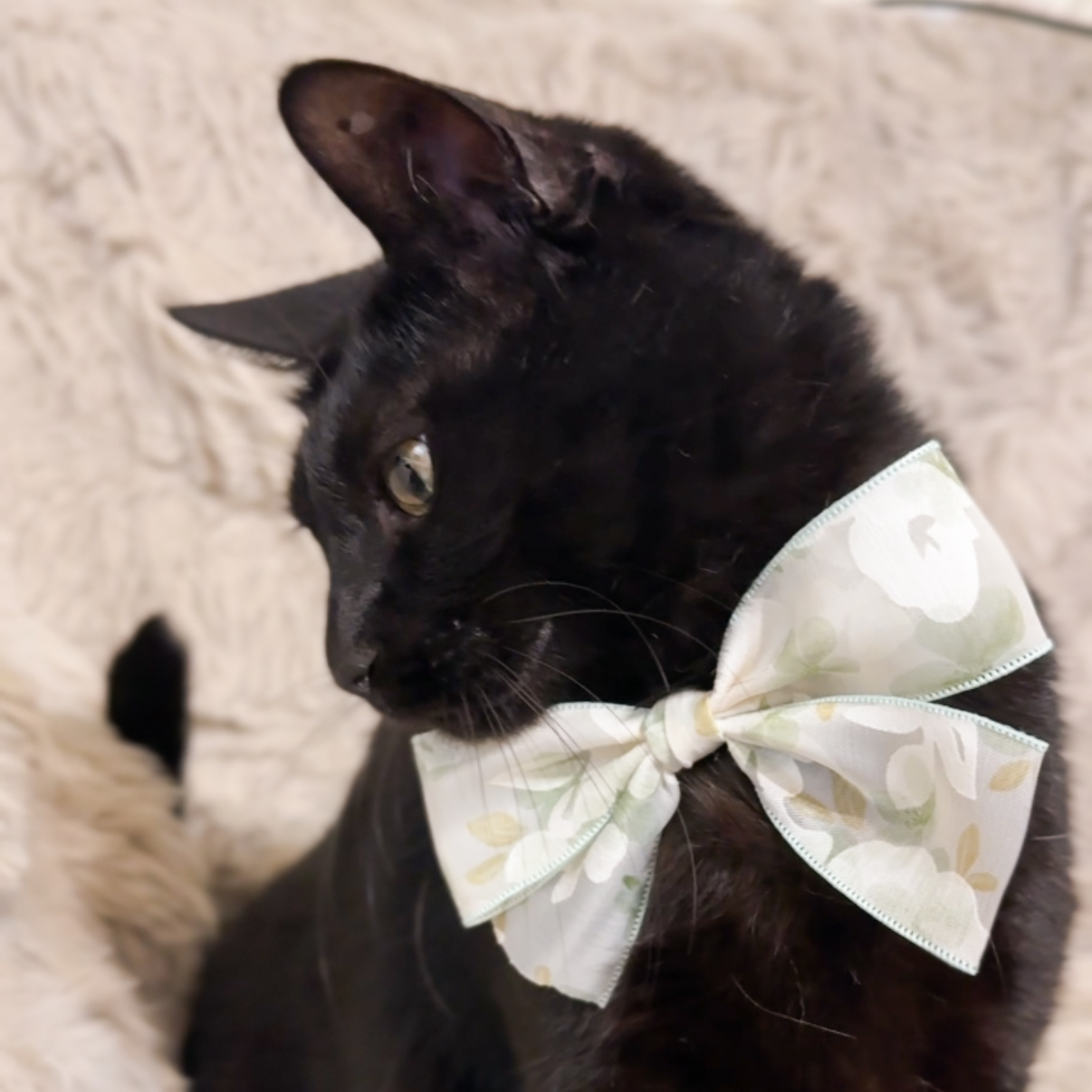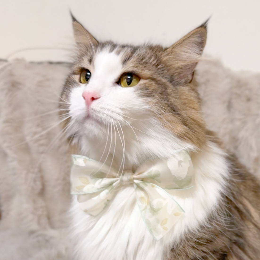 這款【Flora de Soie】系列是我們對極致浪漫的詮釋。選用帶有細緻光澤的歐根紗緞帶,疊加半透明的水彩花卉印花,讓層次感在光影下跳動。這不僅僅是一件飾品,更是賦予毛孩一種從容優雅的貴族儀式感。