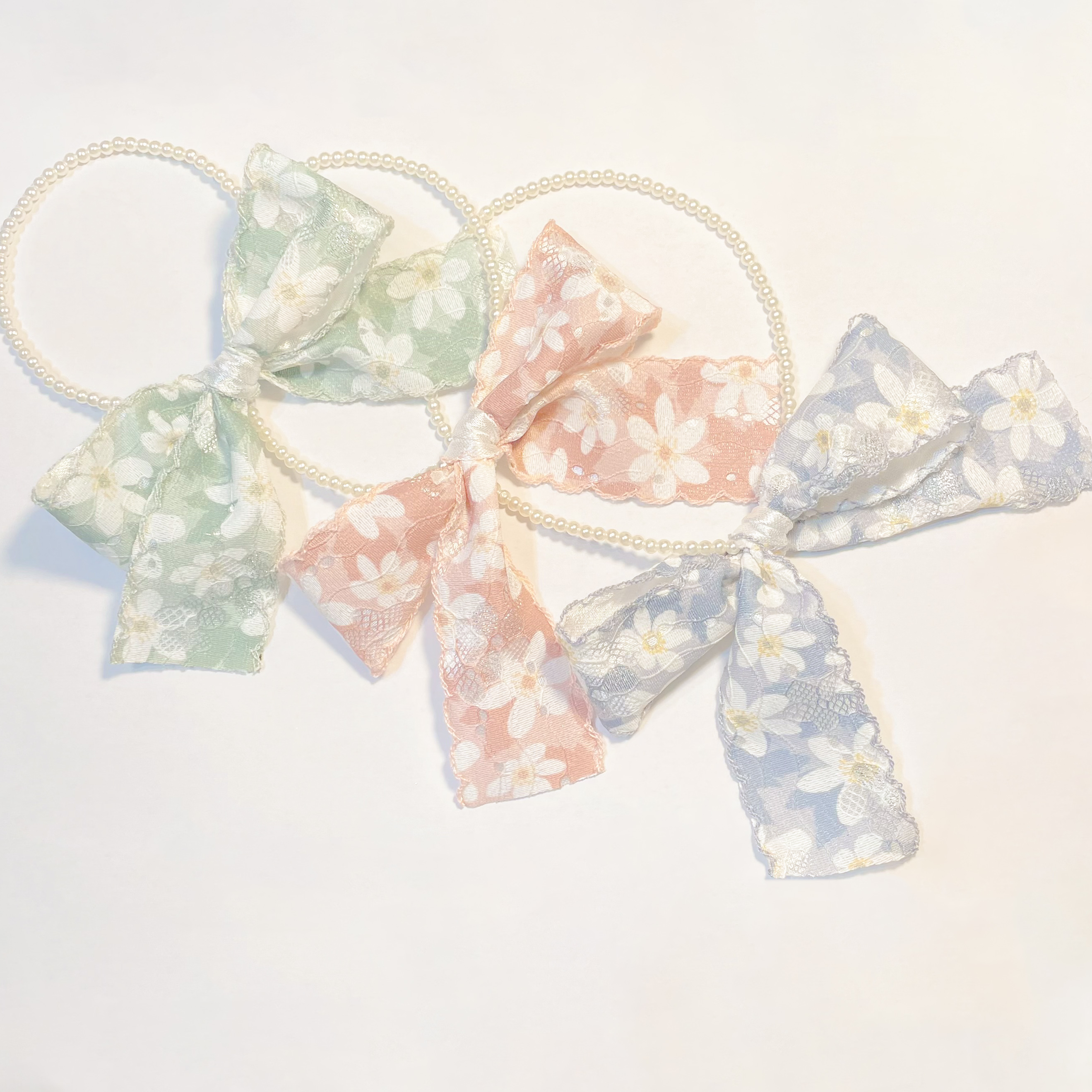 嚴選帶有微光澤的立體刺繡緞帶,搭配職人手工串起的珍珠飾鏈,